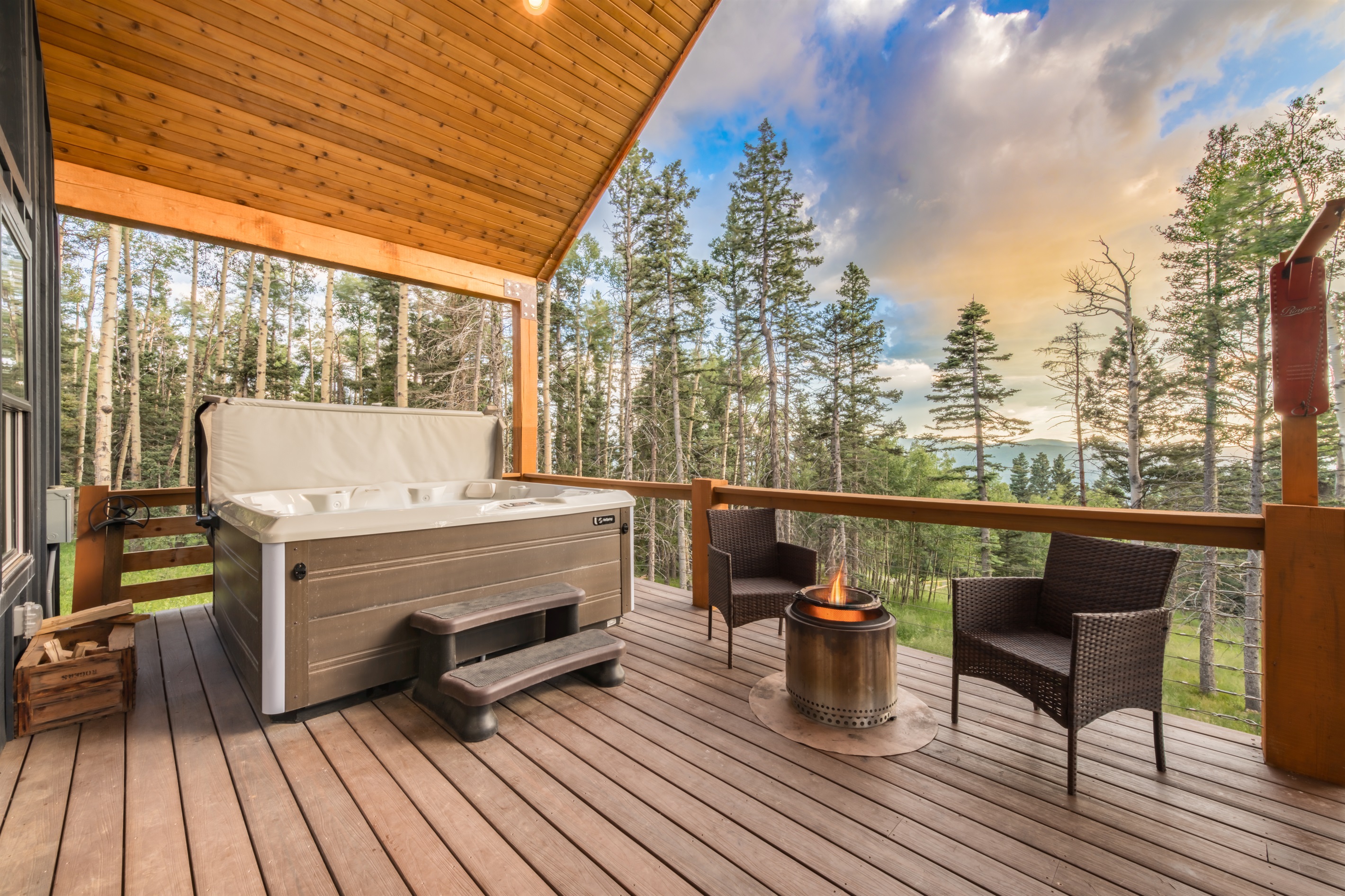 Expansive back deck with lounge seating, fresh mountain air and beautiful sunset